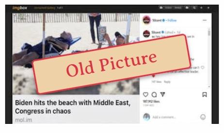 Fact Check by: Ed Payne Does a photo on social media show President Joe Biden sunbathing on a beach during the Hamas-Israel conflict and House speaker crisis in October 2023? No, that's not true: The picture shows the president and first lady Jill Biden at Rehoboth Beach, Delaware, on August 2, 2023. While the first couple did spend the weekend of October 20, 2023 in Delaware, they were not photographed sunbathing. The claim appeared in a post (archived here) published on Instagram from the account of American rapper and actor 50 Cent on October 22, 2023, under the title "Biden hits the beach with Middle East, Congress in chaos." The photo of the Bidens appeared in a Daily Mail article (archived here) published on August 2, 2023, with the title "EXCLUSIVE: Sleepy Joe! Biden sneaks in a NAP as he hits the beach with Jill againA couple of pictures from the article show the president snoozing on a warm August day Delaware beach walk However, multiple news organizations did report that the Bidens walked along the beach on October 22, 2023, on a chilly Sunday afternoon. A Google search (archived here) on October 23, 2023, using the terms "Joe and Jill Biden walking beach October 2023," shows the president and the first lady taking a stroll: (Source: Google screenshot taken on Mon Oct 23 15:38:32 2023 UTC) ---------------------------------------------------------------------------------------------- |