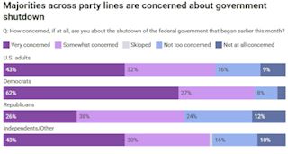 Americans increasingly concerned about government shutdown, more blame Republicans and Trump than Democrats: Poll ByEmily Guskin Thursday marks the 30th day of the federal government shutdown and the American public has grown more concerned about the shutdown throughout the month and more disapprove of how President Donald Trump is handling the federal government, according to an ABC News/Washington Post/Ipsos poll conducted using Ipsos’ KnowledgePanel. More Americans blame Trump and the Republicans in Congress than the Democrats for the shutdown, the poll finds. Three-quarters of Americans say they are concerned about the government shutdown, up from two-thirds who said the same on the first day of the shutdown in a Washington Post poll. Now, 43% of Americans say that they are "very" concerned about the shutdown, up from 25% on Oct. 1. Nearly half of Americans, 45%, say Trump and congressional Republicans are responsible for the shutdown, while 33% say congressional Democrats are responsible and another 22% are not sure. That is barely a shift from the Post’s poll on Oct. 1 when 47% blamed Trump and Republicans, 30% blamed Democrats and 23% were unsure at the onset of the shutdown. ![]() Democrats are more united, saying that Trump and Republicans are to blame for the shutdown (81%) than Republicans saying Democrats are to blame (72%). Twice as many independents say Trump and Republicans are responsible (46%) than Democrats (23%). Majorities across partisan lines say they are concerned about the shutdown: Nearly nine in 10 Democrats along with over seven in 10 independents and over six in 10 Republicans are concerned about the shutdown, but more Democrats say they are “very” concerned (62%) than independents (43%) or Republicans (26%). Concern over the shutdown is higher among women, with 81% voicing concern, compared with 68% of men. And a growing share of Americans disapprove of how Trump is managing the federal government. In all, 63% disapprove today, up from 57% in April and 54% in February. Just over a third (36%) approve in the most recent poll. ![]() The ABC/Post/Ipsos poll asked Americans to explain why they think either Trump and Republicans or Democrats are to blame for the federal government shutting down. Here are some of their written responses: Among those blaming Trump and Republicans: "They won't budge on the concerns of healthcare premiums skyrocketing for all Americans. He is not for all Americans, only his interests matter," said a 65-year-old Democratic woman in Wisconsin. "They seem more interested in keeping power than working for the country's benefit," said a 78-year-old Republican-leaning independent man in Oregon. "They control all of the portions of the federal government," said a 45-year-old Democratic man in Tennessee. "Trump is the president and the Republicans hold the majority. Not only that, Speaker Johnson let out the House on vacation, and Trump/Republicans won’t even try to work with Democrats on the loss of healthcare funding that is going to hurt millions of people," said a 34-year-old Democratic woman in Minnesota. "Trump said it himself a few years ago that it’s the President’s job to bring the 2 sides together," said a 59-year-old Democratic-leaning independent woman in Pennsylvania. "President Trump and the Maga GOP are refusing to negotiate over the Affordable Care Act expiration regardless of the negative impact on many of their supporters and they have no alternative plans for keeping the cost of healthcare from rising," said a 69-year-old Democratic woman in Virginia. "The Republicans control Congress. They won’t negotiate. Of course they’re responsible. We cannot take healthcare away from millions of Americans,” said a 40-year-old Democratic woman in Iowa. “They refuse to negotiate in good faith,” said a 78-year-old Democratic-leaning independent man in Ohio. |