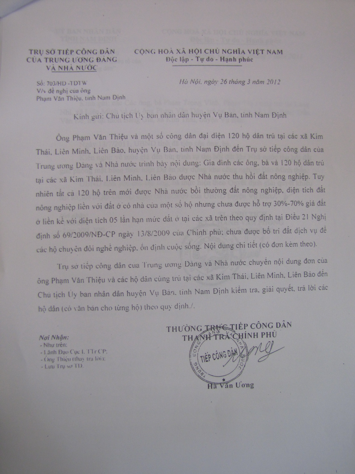 Tôi đăng tất cả lên trang tin này để các cấp chính quyền trung ương, tỉnh Nam Định và huyện Vụ Bản xem lại và có câu trả lời cho công luận được rơ, trước khi tiến hành cưỡng chế tiếp ruộng đất của bà con vào ngày mùng 9 tháng 5 theo như thông báo khẩn cấp của bà con hôm nay. Đây là một văn bản của chính quyền địa phương thuộc tỉnh Nam Định - nơi quê hương của cố Nhạc sỹ Văn Cao, quê hương của Cựu Bộ trưởng ngoại giao Nguyễn Cơ Thạch và anh Phạm B́nh Minh, Bộ trưởng ngoại giao Việt nam hiện nay: Nhiều văn bản bất hủ được ban ra, chỉ đạo một cách vô luật pháp như thế này. Trung ương chỉ đạo về địa phương giải quyết. Tỉnh chỉ đạo huyện. Huyện ra văn bản giải quyết. Tiếp tục văn bản... giải quyết. Dân đang tiếp tục khiếu nại th́ có thông báo mùng 9 tháng 5 tới sẽ tiếp tục... cưỡng chế! Chắc Nam Định học theo Hưng Yên đây ? một dự án công nghiệp, giao đất cho các tập đoàn tư nhân vậy theo luật th́ phải làm ra sao, phải thỏa thuận với Dân thế nào, chưa giải quyết xong có được được dùng quân đội và công an cùng các lực lượng đến trấn áp Dân để đè nghiến ra lấy đất không? ![]() ![]() ![]() ![]() ![]() ![]() ![]() ![]() Trong một diễn biến khác, rất căng thẳng và nóng bỏng: Nhân dân Văn Giang đă gửi đơn tố giác : Đơn tố giác nghi vấn giả tài liệu của Chính phủ: ![]() . ![]() ![]() ![]() ![]() .. ![]() ![]() ![]() . ![]() ![]() ![]() ![]() ![]() ![]() ![]() ![]() Tỉnh Nam Định cần trả lời sớm cho công luận biết những việc này, hiện nay đơn từ của Nhân dân trong Huyện Vụ bản vẫn đang tiếp tục được gửi đi, yêu cầu được các cấp chính quyền phải làm mọi việc trong khuôn khổ luật pháp. Lê Hiền Đức |