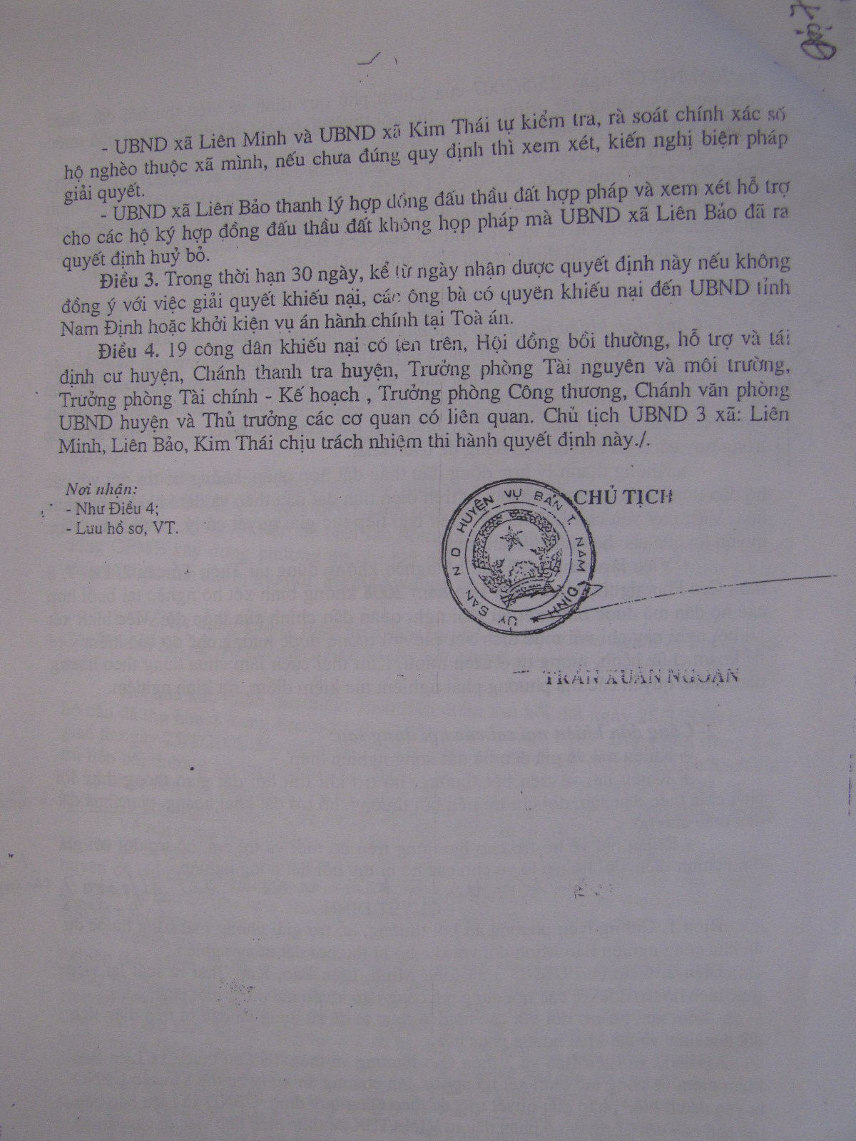 Liên quan đến Dự án khu công nghiệp Bảo Minh, nhân dân tại huyện Vụ Bản, Tỉnh Nam Định cung cấp cho trang tin những văn bản liên quan đến khiếu nại của nhân dân trong việc giải quyết các vấn đề tranh chấp đất đai, đền bù cưỡng chế, dùng quân đội và công an cưỡng chế đất cho dự án khu công nghiệp Bảo Minh.