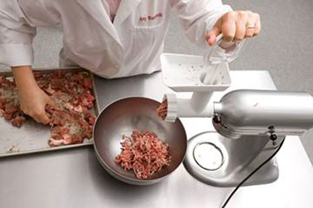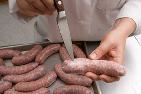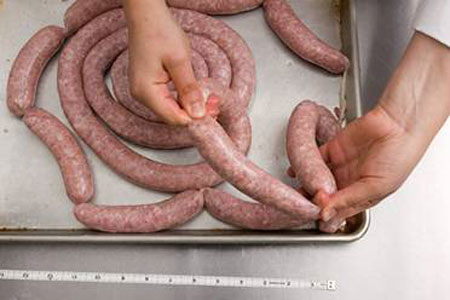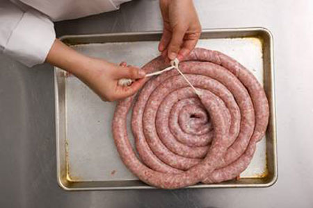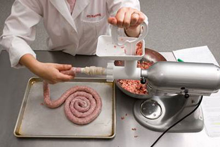 Attachment 617061 Xúc xích làm tại nhà vừa vừa ngon, vừa đảm bảo an toàn vệ sinh thực phẩm. Ảnh internet Nguyên liệu5m ruột non heo 1,5kg thịt đùi heo 1,5kg thịt đùi bê 100g mỡ thăn 3 thìa cà phê muối, 2 thìa cà phê đường, 2 thìa cà phê tiêu, 3 thìa cà phê hạt thì là, 3 thìa cà phê ngò tây băm nhuyễn Attachment 617063 Thực hiện -Thịt và mỡ rửa sạch, để ráo, cho vào tủ đá 1-2 tiếng tới khi lạnh cứng. Thái thịt, mỡ thành miếng nhỏ. Ruột non bóp sạch với muối, giấm, tách bỏ lớp màng ngoài, rửa sạch, để ráo. -Trộn thịt, mỡ cùng với các loại gia vị với nhau và cho vào tủ đá để khoảng 30 - 60 phút. Cho luôn các dụng cụ xay thịt vào tủ để giữ lạnh. Attachment 617064 - Khi thịt đã đủ lạnh, lấy ra đem xay nhuyễn. Lưu ý không xay quá lâu vì sẽ khiến xúc xích thành phẩm bị bở. Nếu muốn xúc xích nhuyễn mịn, dai ngon thì sau khi xay lần 1, cho thịt trở lại vào tủ đá khoảng 30 phút sau đó lấy ra xay tiếp. Attachment 617065 -Thoa chút dầu ăn vào lòng phễu, đút phần ruột non vào máy nhồi thịt, thắt nút phần đuôi lại. Nếu không có máy dồn thịt có thể làm thủ công bằng cách dùng một chiếc phễu. Lưu ý vừa nhồi vừa thuôn để tránh rách lòng. Attachment 617066 -Cho thịt vào máy nhồi thịt, dồn thịt từ từ vào ruột non. Khi dồn chú ý làm nhẹ, đều tay để miếng xúc xích được đều và tránh làm ruột non bị rách. Attachment 617067 -Khi nhồi thịt vào để ý thấy dây lòng còn khoảng 10cm thì ngưng. Chừa khoảng 4cm tạo một nút thắt để cố định. Lưu ý không cột quá chặt, xúc xích khi hấp hoặc chiên sẽ bị nứt, vỡ. Attachment 617068 Attachment 617069 -Canh xúc xích thành đoạn ngắn từ 10-15 cm tùy thích, sau đó xoắn lại, lấy chỉ hoặc dây mỏng buộc thành từng đoạn vừa ăn. Attachment 617070 -Sau đó, cho xúc xích vào nồi hấp khoảng 15 - 20 phút, lấy ra cắt theo từng khúc, bỏ chỉ. Trong khi hấp, để xúc xích không bị vỡ nên lấy tăm hoặc dao nhọn xăm vài lỗ lên trên. Attachment 617071 Hấp xong lấy xúc xích ra để nguội, nếu chưa ăn ngay có thể cho vào tủ đông để dùng dần; còn nếu ăn liền thì chiên hoặc nướng đều ngon. Với món xúc xích này bạn có thể đem hun khói hay luộc sơ lại, dọn ra với khoai tây chiên, tương cà, nước xốt sẽ là món ngon cho cả trẻ con và người lớn. wk |
