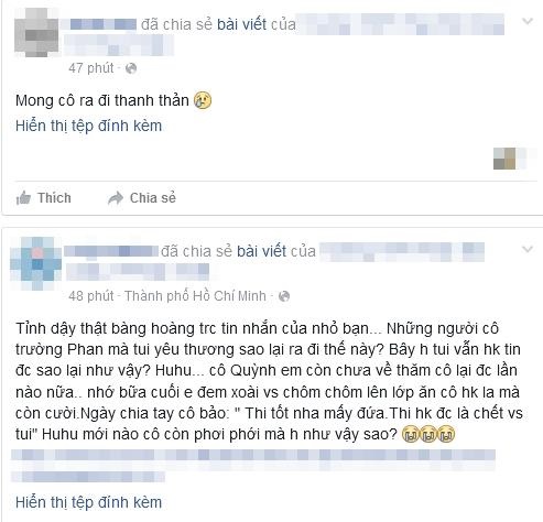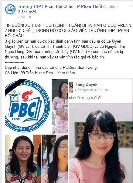 Hàng trăm học sinh Phan Bội Châu đang vô cùng đau xót, bàng hoàng trước sự ra đi của 3 giáo viên trong trường Vụ tai nạn thảm khốc xảy ra vào khoảng 11g30 ngày 19-6, xe khách 42 chỗ của công ty du lịch Lê Mỹ di chuyển từ TP Đà Lạt xuống đèo Prenn (cách trung tâm Đà Lạt 3 km) th́ mất kiểm soát, tông vào một công nhân làm đường rồi tiếp tục tông vào hông xe 32 chỗ của hăng Thanh Lịch đi từ hướng đèo Prenn về TP Đà Lạt gây tai nạn làm 7 người thiệt mạng, trong đó có 3 giáo viên trường THPT Phan Bội Châu (B́nh Thuận). Dư luận vẫn c̣n đang xôn xao vụ tai nạn nói trên, nhưng đau ḷng hơn khi học sinh trường THPT Phan Bội Châu (B́nh Thuận) khi hay tin giáo viên ḿnh tử nạn. Trên facebook của Trường THPT Phan Bội Châu mới đây đă đăng tin buồn thông báo các giáo viên Lê Uyên Quỳnh (dạy văn), Lê Thị Thanh Liên (dạy giáo dục công dân), Nguyễn Thị Ngọc Dung (dạy toán) đă tử vong. Một cô giáo khác là Nguyễn Thị Thanh Thủy dạy toán đang bị thương. Attachment 900551 Ảnh: FB Trường THPT Phan Bội Châu (B́nh Thuận) Attachment 900550 Trước đó, vào 11h 30 ngày 18/6, trên Facebook của cô giáo Song Quỳnh đăng ảnh và ḍng trạng thái: “Coi như là… xong xuôi đi”. Rất nhiều học sinh đă thương tiếc và chia sẻ ḍng trạng thái này của cô Quỳnh và thương tiếc cho sự ra đi của cô khi c̣n khá trẻ. “Những người cô trường Phan mà tui yêu thương sao lại ra đi thế này? Bây h tui vẫn không tin đc sao lại như vậy?”- bạn H.B xúc động chia sẻ. “Cô Uyên Quỳnh dạy Văn năm lớp 10. Cô trẻ, nhiệt huyết với nghề, vui tính lắm. Lúc đọc tin người tử vong có cô Quỳnh dạy Văn th́ ng đă bần thần và hỏi tứ tung người, cũng chỉ mong không phải là cô. Nhưng…đó là sự thật. Cô đi b́nh an nhé. Trường PBC sẽ vắng bóng cô, nhưng mọi ng sẽ nhớ cô rất nhiều.”– A.N viết “Tiết GDCD của cô hàng ngày vẫn c̣n đó. C̣n cô đă đi rồi…”– T.B chia sẻ. Attachment 900552 Attachment 900553 Đây là một tin buồn và sự mất mát lớn cho trường THPT Phan Bội Châu, hàng trăm học sinh đă cùng nhau chia buồn trước sự ra đi của cô giáo mà các em yêu mến . T.N (tổng hợp) Theo yeah1.com |