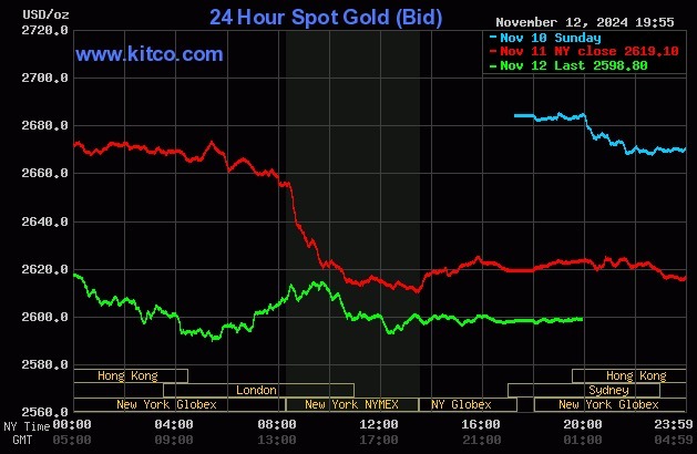 Chốt phiên giao dịch ngày 12/11, giá vàng thế giới giao ngay giảm 21 USD xuống 2.597 USD một ounce. Có thời điểm mỗi ounce xuống 2.589 USD.