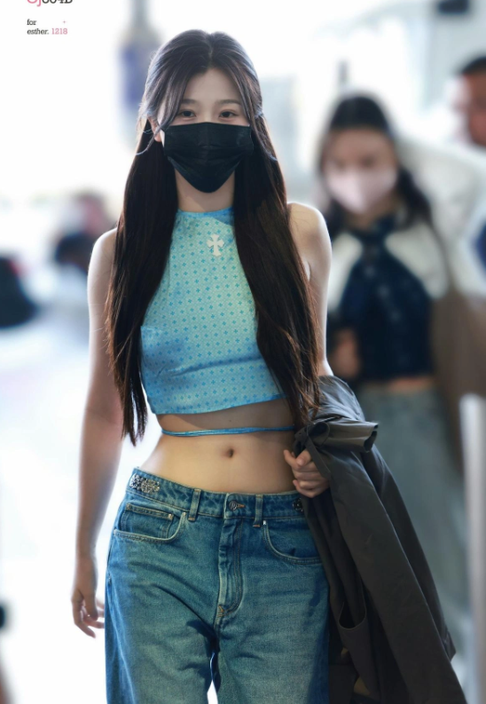 Bên cạnh đó, Ngu Thư Hân kết hợp thêm quần cạp trễ, để lộ vòng eo “con kiến” vạn người mê. Xuyên suốt thời gian xuất hiện ở sân bay, Ngu Thư Hân gần như che kín mặt, nhưng vẫn để lộ đôi mắt to tròn, tinh nghịch. Nữ diễn viên để tóc đen, thẳng đơn giản, “đu trend” nhảy theo nhạc ở sân bay.