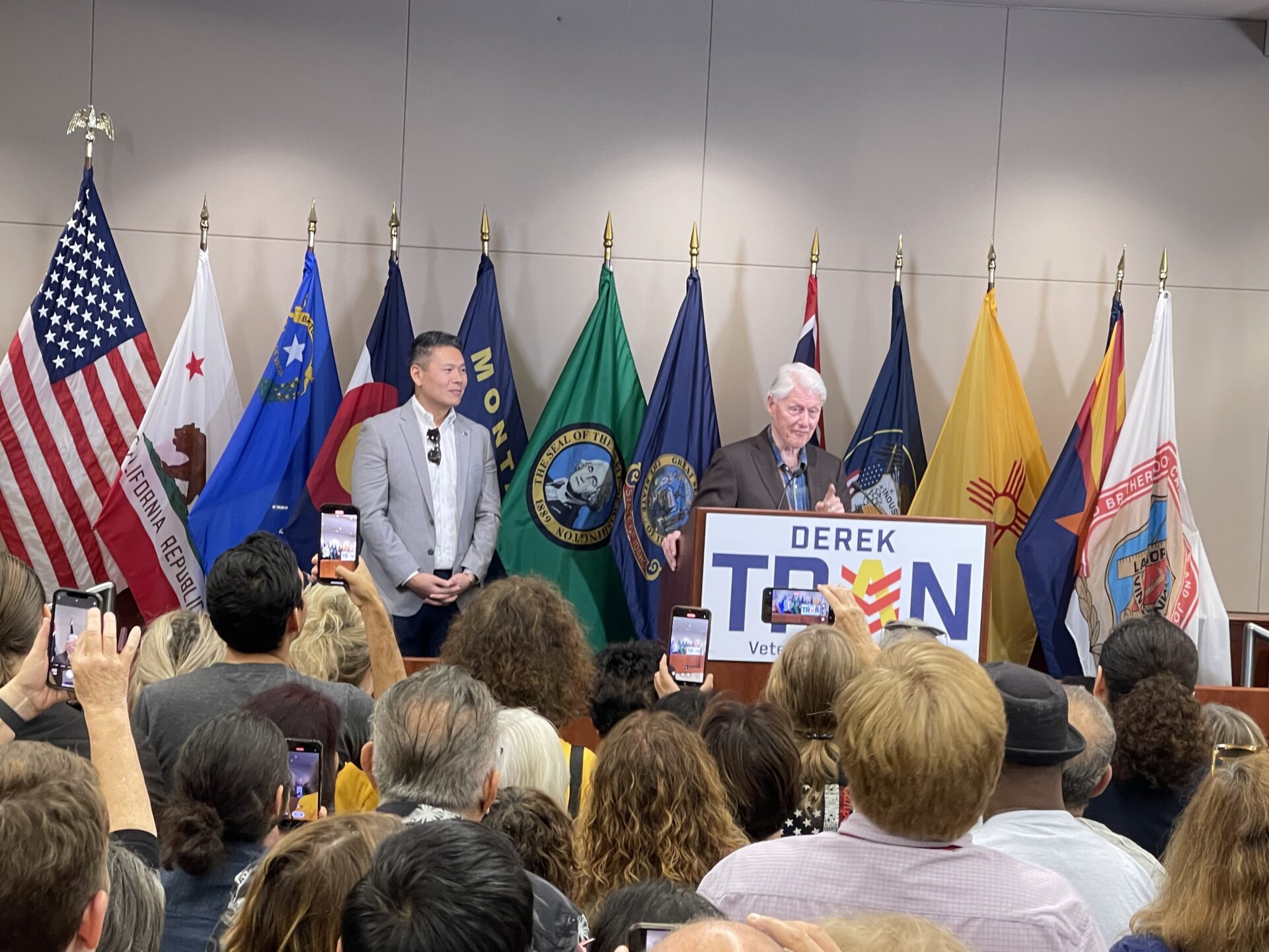 Cựu Tổng thống Bill Clinton (phải) và Luật sư Derek Trần trong cuộc vận động ở Buena Park hôm 26 tháng Mười. Đây là lần đầu tiên một cựu Tổng thống đến vận động cho một ứng cử viên gốc Việt vùng Little Saigon. (H́nh minh họa: Đỗ Dzũng/Người Việt)