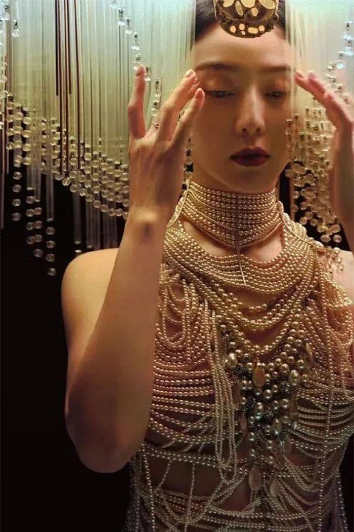 Tay nghề làm bộ vương miện pha lê này rất tinh xảo, thiết kế của bộ quần áo cũng rất độc đáo. Nhà tạo mẫu xâu chuỗi ngọc trai lại với nhau để tạo nên một chiếc váy xuyên thấu màu ngọc trai. Mỗi chiếc váy đều được thiết kế cẩn thận, vừa vặn với vóc dáng thanh tú của Phạm Băng Băng, những đường cong cơ thể hoàn hảo lộ ra trong máy ảnh. Bờ vai vuông vức cùng đường vai và cổ kiêu hãnh của cô đặc biệt bắt mắt. Thiết kế xuyên thấu khoe vòng eo thon gọn của Phạm Băng Băng. Tỷ lệ vòng eo khiến mọi người ghen tị.