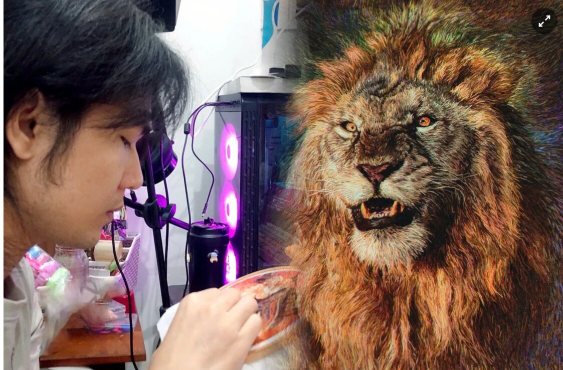 Tác phẩm kỳ công nhất cho tới nay của Khiêm là h́nh chú sư tử dũng mănh được hoàn thành sau 10 ngày, mỗi hôm hơn 10 tiếng. Anh tỉ mỉ chuyển nét và màu để tả chính - phụ, xa - gần, điều chỉnh quang độ để lột tả khí chất của “chúa tể thảo nguyên”.