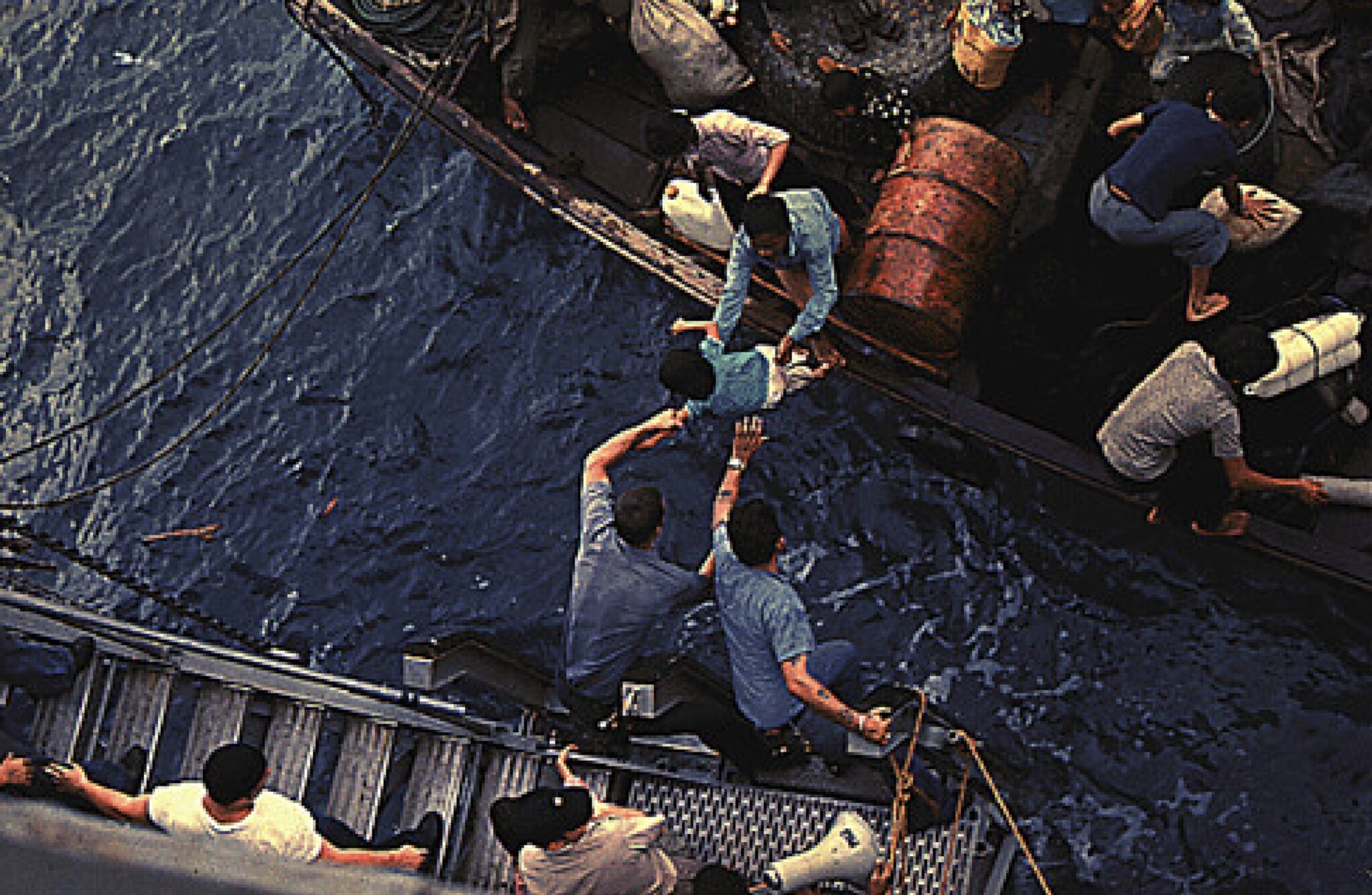 Cảnh thuyền nhân Việt được chiến hạm USS Durham cứu vớt. (H́nh: USNA)