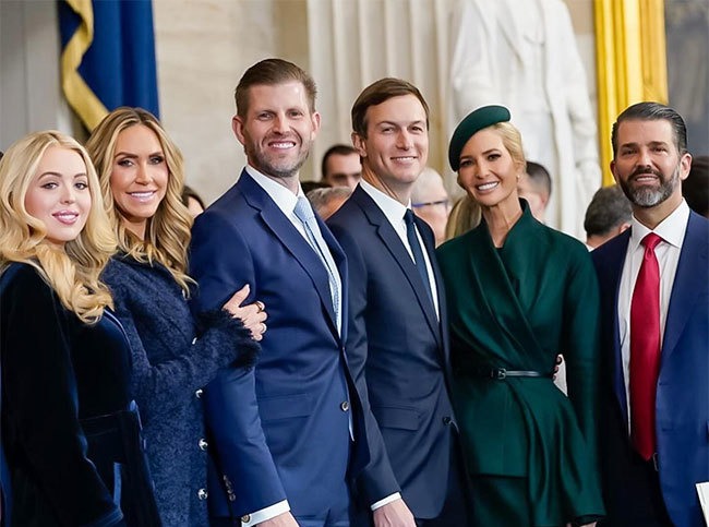 Các con trai, gái dâu rể nhà Tổng thống Trump gồm Tiffany, Lara Trump, Eric Trump, Jared Kushner, Ivanka và Donald Trump Jr (từ trái qua) trong lễ nhậm chức của bố hôm 20/1. Ảnh: Instagram Ivanka Trump