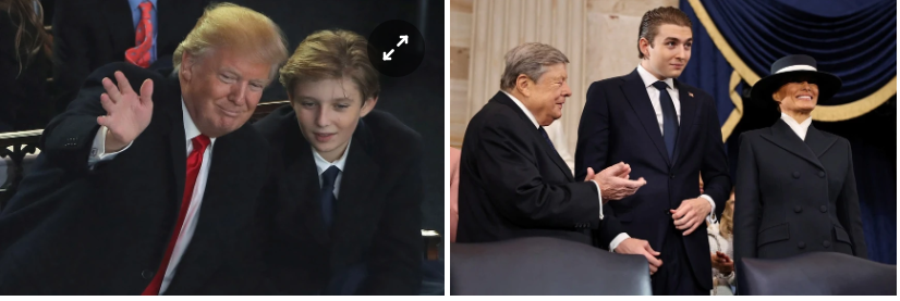Khác với lần nhậm chức đầu tiên của cha cách đây 8 năm, khi Barron mới là một cậu bé 11 tuổi, lần xuất hiện này, anh thể hiện phong thái trưởng thành hơn hẳn. Thay vì để xõa, mái tóc của anh được vuốt ngược ra đằng sau, thể hiện phẩm chất quý ông.