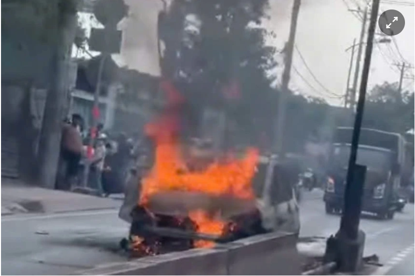 Ngọn lửa nhanh chóng bao trùm toàn bộ xe, khói đen bốc nghi ngút.