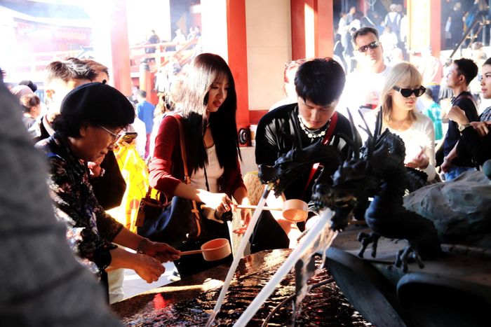 Du khách tranh thủ rửa tay khi viếng đền Asakusa Kannon.