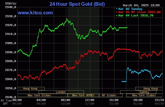 Chốt phiên giao dịch 4/3, giá vàng thế giới giao ngay tăng gần 24 USD lên 2.916 USD một ounce. Trong phiên, giá có thời điểm lên sát 2.930 USD. Từ đầu năm, kim loại quý đã tăng gần 11%.