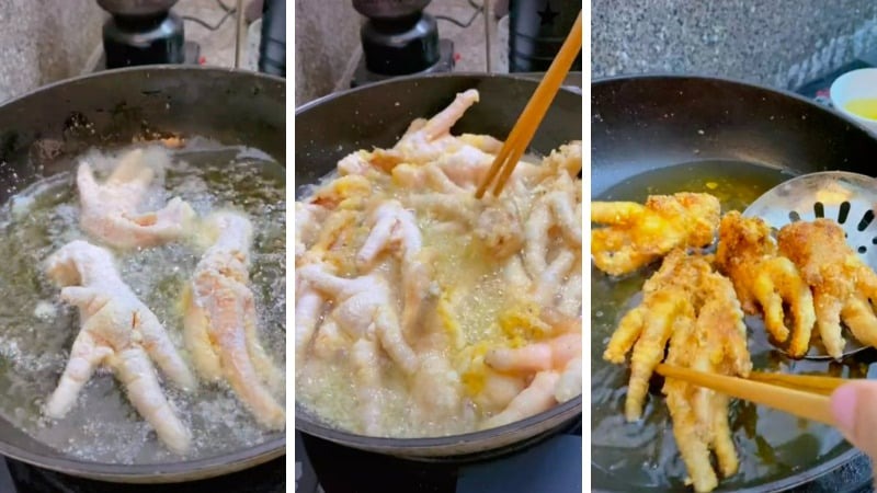 Sau đó bạn cho chân gà chảo chiên trong 15 phút đến khi vàng giòn 2 mặt thì vớt ra.