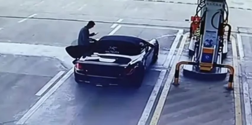 Theo hình ảnh từ camera giám sát, một chiếc Porsche màu đen, không có biển số, tiến vào trạm xăng. Chiếc xe được đổ xăng đầy bình, hết tổng cộng 502,29 Nhân dân tệ (1,7 triệu đồng).