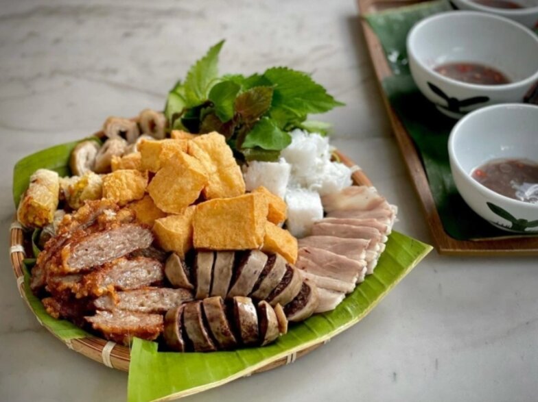 Bún đậu của nhà hàng được bày biện trên chiếc mẹt đan tre, bên dưới lót lá chuối. Mỗi suất đặc biệt có giá 32 USD, gồm bún, đậu rán, chả cốm, ḷng nướng, dồi luộc, thịt lợn và mắm tôm kèm nhiều loại rau thơm. Mắm tôm được pha với đường, nước cốt chanh và ớt Thái.