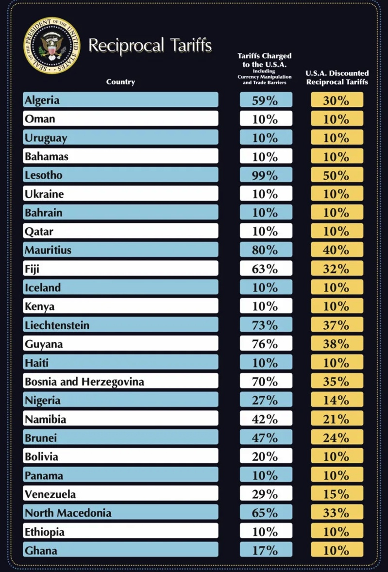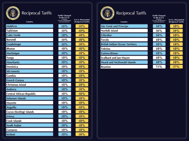 Theo một tờ hướng dẫn cung cấp cho các phóng viên liệt kê mức thuế đối với 25 quốc gia, mức thuế mà Trump công bố hôm nay sẽ dao động từ 10% đến 49% tùy theo từng quốc gia.