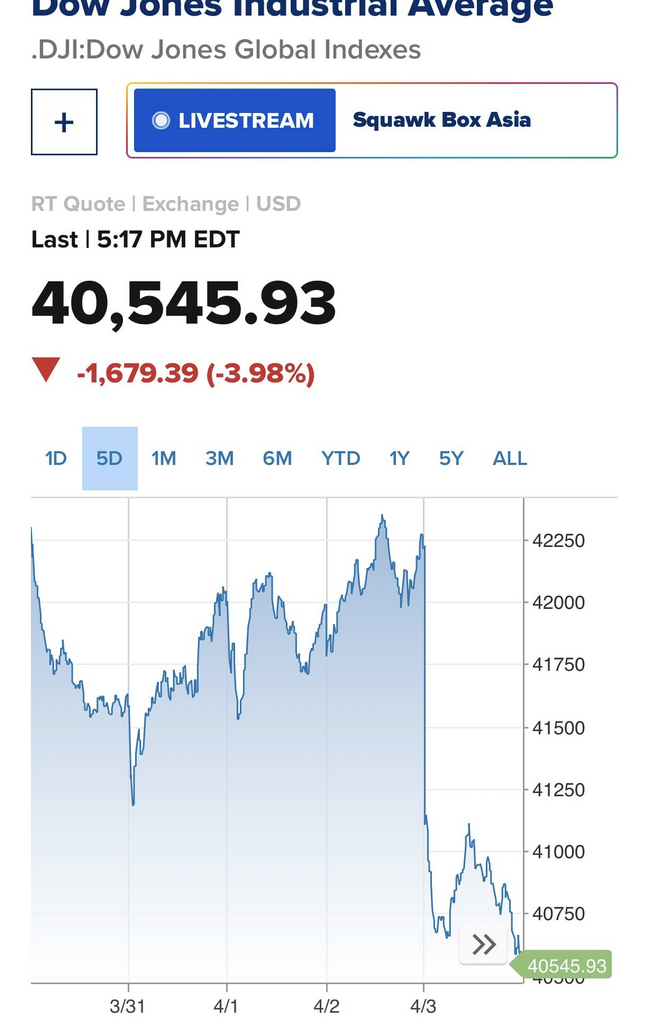Chỉ số S&P 500 giảm 4,84%, chốt phiên ở mức 5.396,52 điểm, phiên giao dịch tệ nhất kể từ tháng 6/2020. Chỉ số trung b́nh công nghiệp Dow Jones giảm 1.679,39 điểm (tương đương 3,98%), chốt phiên ở mức 40.545,93 điểm. Trong khi đó, Nasdaq Composite lao dốc 5,97%, đóng cửa ở 16.550,61 điểm. Đây cũng là mức giảm mạnh nhất kể từ tháng 3/2020.