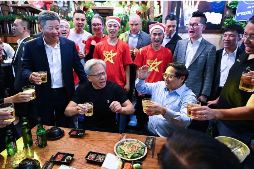 Thủ tướng Phạm Minh Chính và CEO Nvidia Jensen Huang thưởng thức bia chai tại phố Tạ Hiện, Hà Nội, tháng 12/2024. Ảnh: Giang Huy
