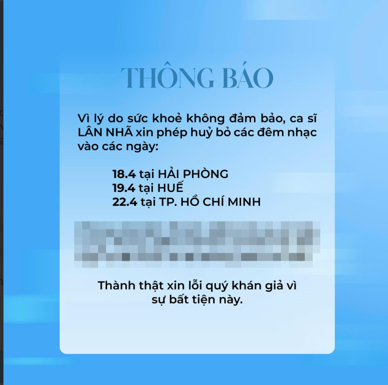 Cụ thể, 3 đêm nhạc bị huỷ diễn ra tại Hải Phòng (18/4), Huế (19/4) và TP.HCM (22/4). Trong thông báo chính thức, Lân Nhã cho biết anh đang trải qua giai đoạn bất ổn về tinh thần và cần thời gian để "đi tìm lại bình an và năng lượng cho chính mình" trước khi có thể tiếp tục đứng trên sân khấu.