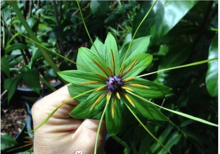 Điểm dễ nhận biết là cây thường có 7 lá xếp vòng tròn, dù đôi khi cũng xuất hiện biến thể 5 hoặc 8 lá. Hoa của nó đặc biệt đến mức từng khiến nhiều người nhầm tưởng không có hoa: cánh hoa nhỏ mảnh như sợi ruy băng, xếp tầng lớp như chong chóng, tạo vẻ ngoài kỳ lạ nhưng đầy cuốn hút.