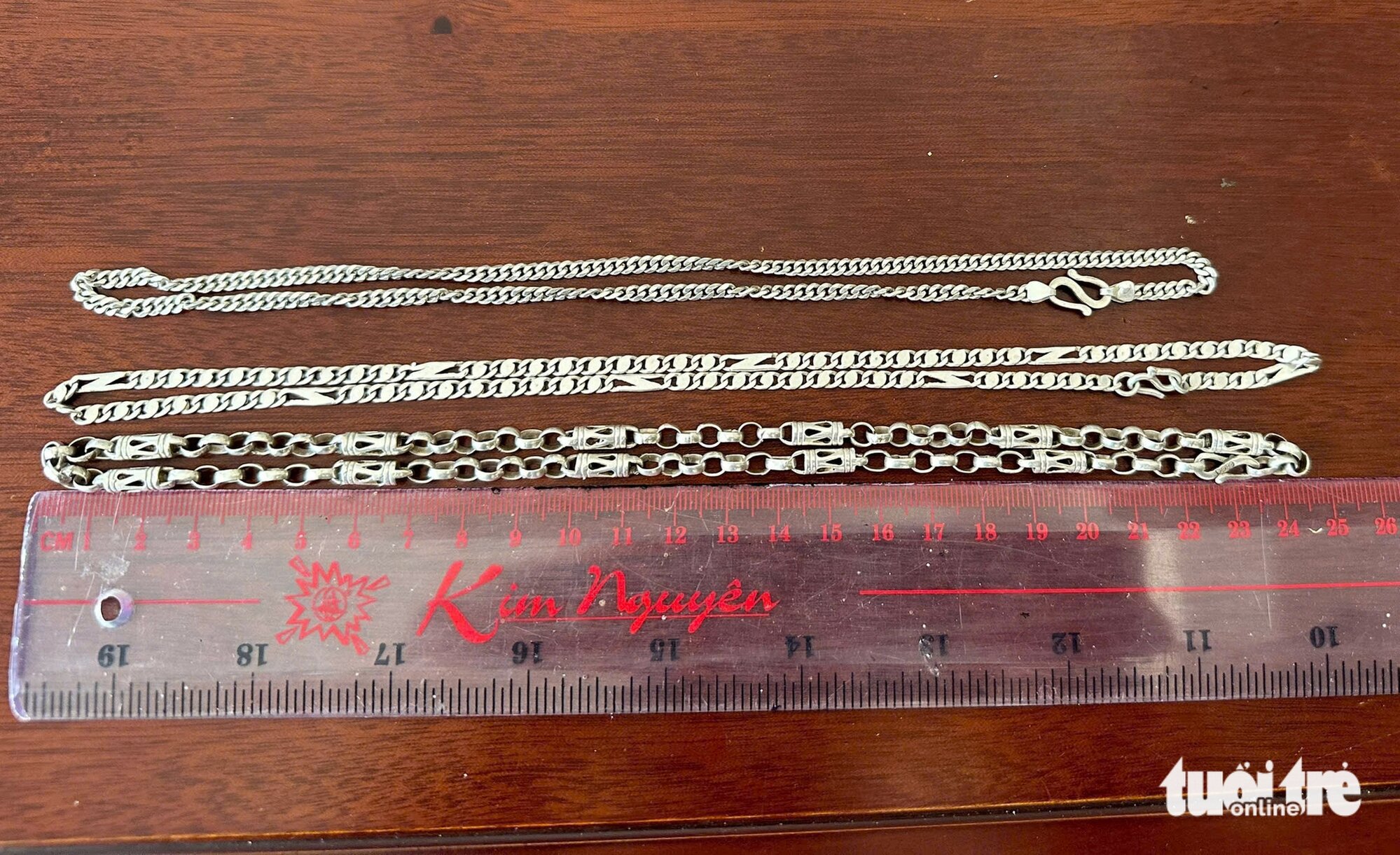 Tang vật thu giữ gồm 3 sợi dây chuyền bằng kim loại màu trắng, 1 xe máy hiệu Sirius màu đỏ đen.