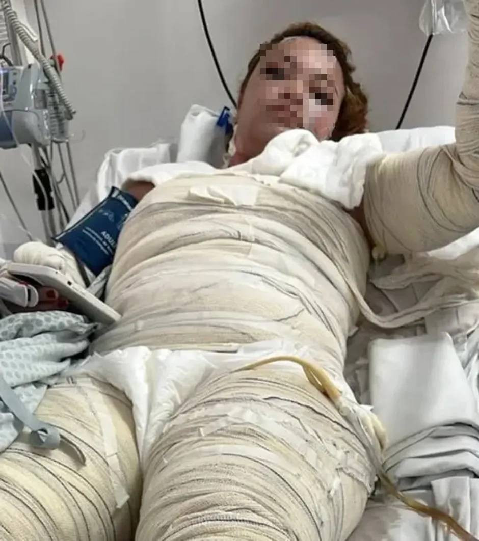 Những hình ảnh từ phòng chăm sóc đặc biệt cho thấy toàn bộ cơ thể của Gabriele được băng bó. Một mảng da lớn cũng bị bong ra khỏi mặt cô.