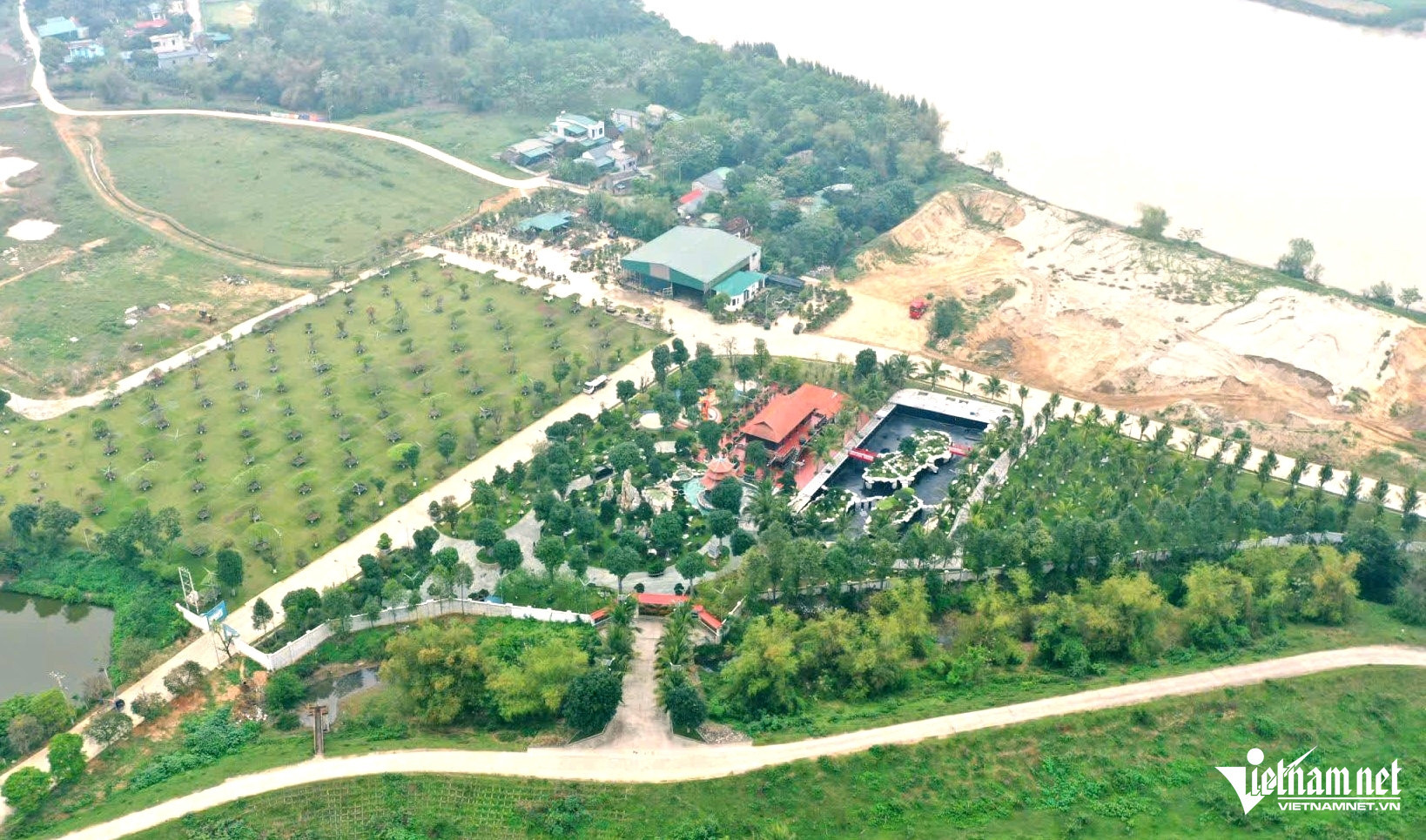 Biệt phủ nằm ở ngoài đê sông Mă được UBND tỉnh Thanh Hóa cho 2 công ty làm băi tập kết cát (không phải Tuấn "thần đèn" đứng tên) xây dựng nhiều hạng mục trái phép.