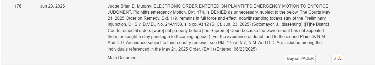 Thẩm phán quận, Brian Murphy của Massachusetts tuyên bố Ý, đâu có được, tui đã ban lệnh không được trục xuất rồi. Lệnh ở dưới.
