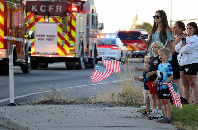 Người dân Kootenai chờ đoàn xe ứng phó vụ xả súng đi qua ở địa phương, ngày 29/6. Ảnh: AP