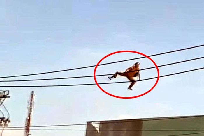 Người phụ nữ có biểu hiện bất thường bò trên dây diện. Ảnh: CTV