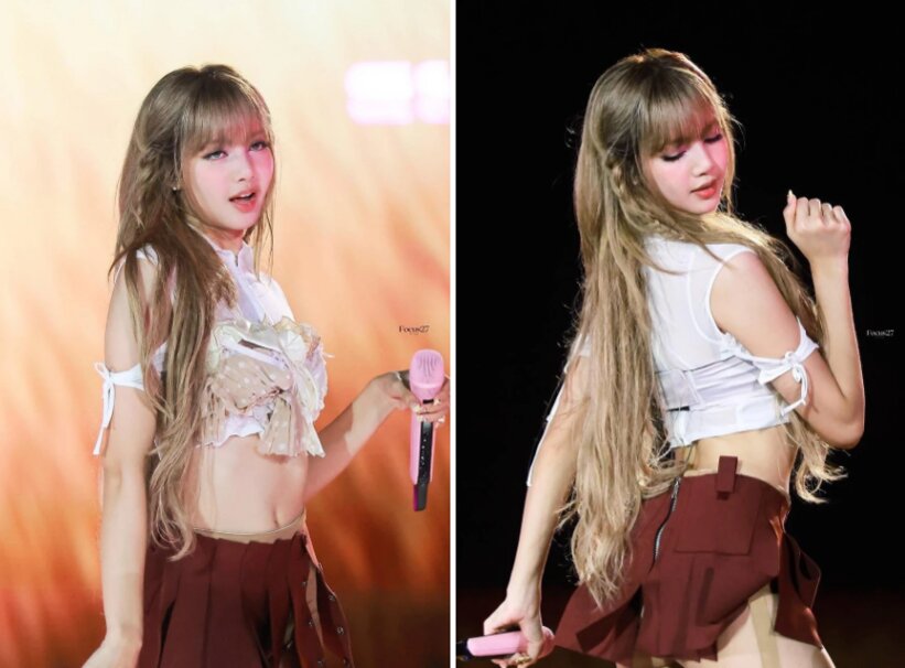 Kiểu tóc mái bằng màu vàng kim, kết hợp lớp trang điểm tông hồng làm nổi bật nét trẻ trung, tươi tắn của nữ idol sinh năm 1997. Trang phục áo crop top kết hợp quần short, chân váy ngắn ôm sát chất liệu sequin hoặc nhấn nhá da bóng làm tôn lên lợi thế vóc dáng. Tạo hình này mang đến hình ảnh một Lisa đậm chất girl crush, vừa mạnh mẽ, cá tính nhưng vẫn không kém phần uyển chuyển, quyến rũ.