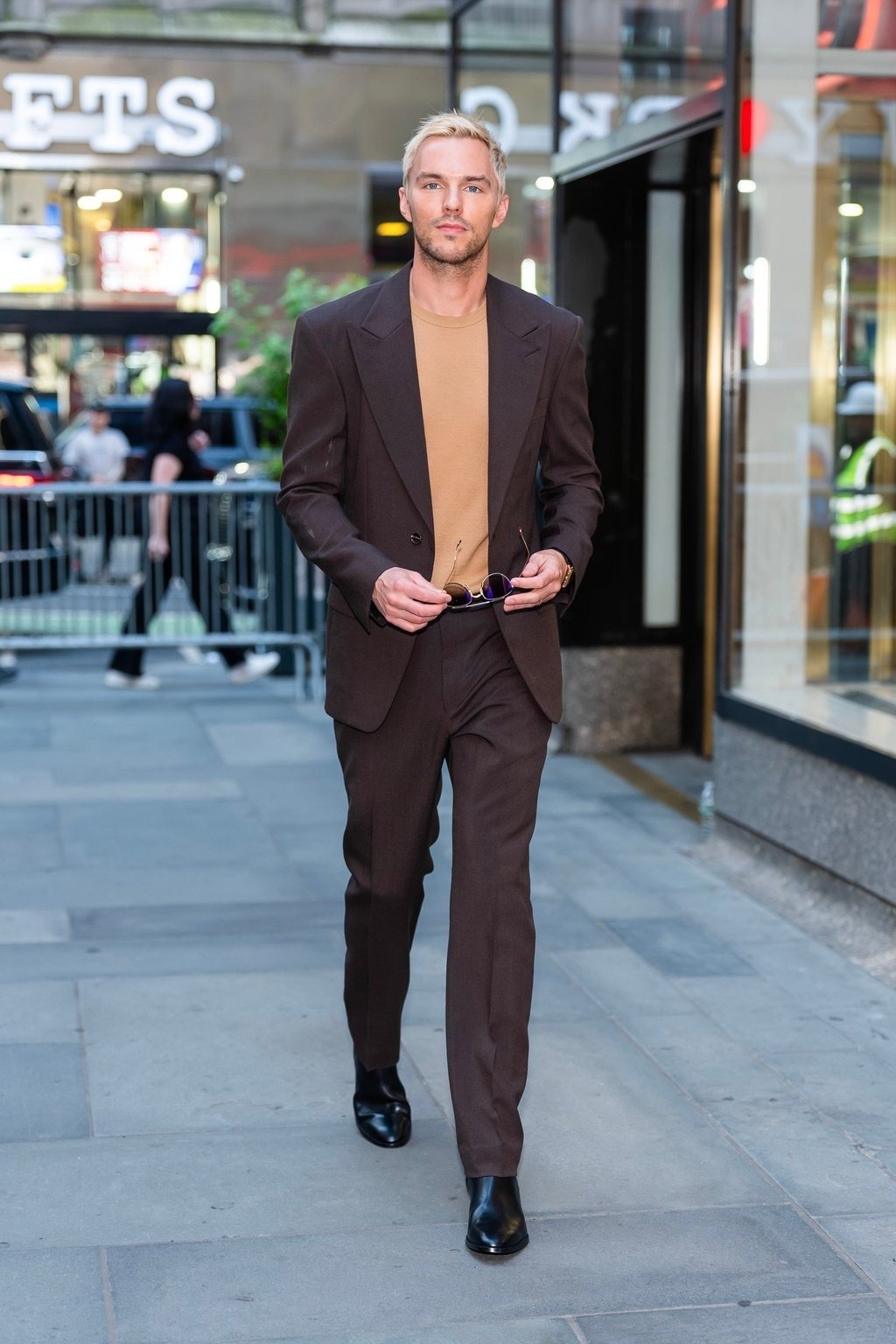 Hôm 30/6, Nicholas Hoult gây chú ý khi mặc ba bộ đồ ở New York. Đầu tiên, anh diện bộ vest Tom Ford màu nâu chocolate do Haider Ackermann thiết kế, áo dệt kim nâu nhạt. Ảnh: GC Images