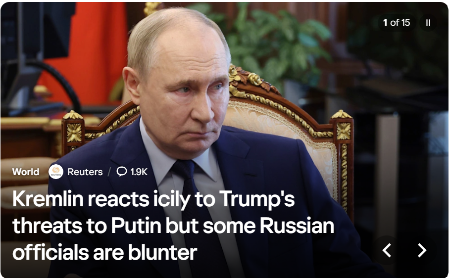 Cựu Tổng thống Dmitry Medvedev, hiện là Phó Chủ tịch Hội đồng An ninh Nga, cho biết Moscow không quan tâm đến "tối hậu thư mang tính kịch" của Trump, trong khi một nhà ngoại giao cấp cao của Nga, Sergei Ryabkov, cho rằng việc đưa ra tối hậu thư cho Moscow là không thể chấp nhận được và vô nghĩa.