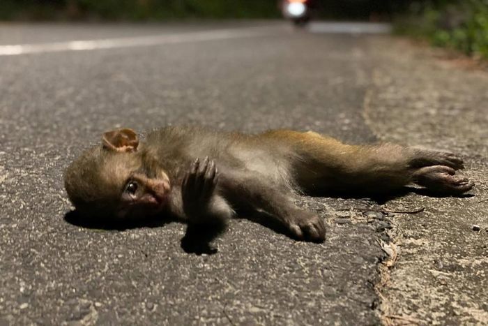 Hình ảnh chú khỉ con nằm lại bên đường sau khi bị xe tông chết. Ảnh: Thanh Ngọc Trúc.