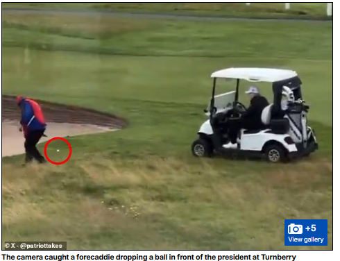 Video được quay từ bên trong một tòa nhà cho thấy khoảnh khắc tổng thống Mỹ lái xe golf đến bên trái đường lăn bóng tại Turnberry - với một hố cát trước mặt và một ít cỏ fescue mỏng bên trái.