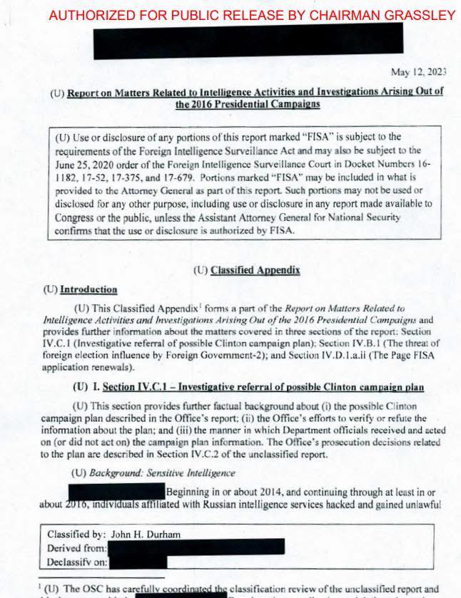 Phụ lục Durham được giải mật xác nhận Hillary Clinton đã đích thân phê duyệt kế hoạch gài bẫy Trump bằng cáo buộc Nga tấn công mạng bầu cử Hoa Kỳ để đánh lạc hướng khỏi những email bị mất của bà và làm mất uy tín của Trump.