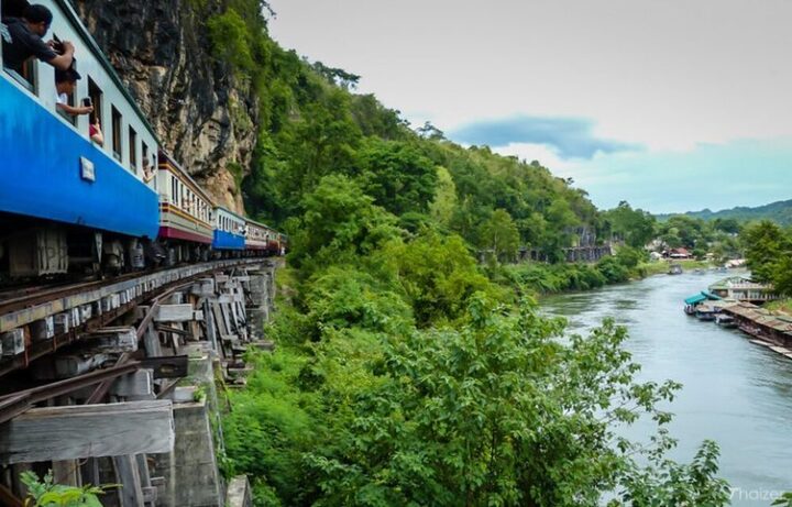 Chuyến tàu khởi hành từ ga Bangkok Thonburi, len lỏi qua những cánh rừng rậm rạp, nơi cành cây gần như chạm vào cửa sổ toa tàu, tạo cảm giác phiêu lưu đặc biệt. Tiếp đó, đoàn tàu băng qua cây cầu sắt nổi tiếng bắc qua sông Kwai, đi qua những nhà ga nhỏ với gam màu rực rỡ trước khi dừng tại ga Nam Tok.