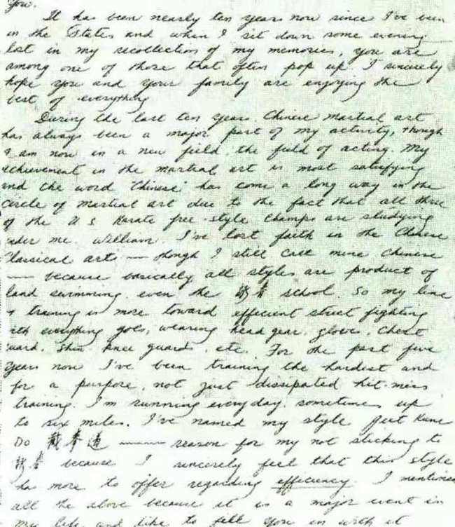 Trong bức thư được họ Lý viết bằng tiếng Anh có đoạn rất đáng chú ý với nội dung: "William, mặc dù tôi vẫn tuyên bố sử dụng võ thuật Trung Quốc, nhưng tôi đã mất niềm tin vào võ Trung Quốc. Bởi vì hầu hết tất cả những môn võ Trung Quốc đều giống như bơi trên cạn, ngay cả trong môn Vịnh Xuân Quyền cũng như vậy".