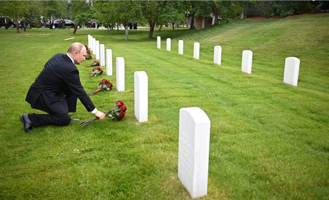 Tổng thống Nga Vladimir Putin đặt ṿng hoa tưởng niệm tại phần mộ các binh sĩ Liên Xô trong Nghĩa trang Quốc gia Fort Richardson, gần thành phố Anchorage, Alaska. Ảnh: Reuters.