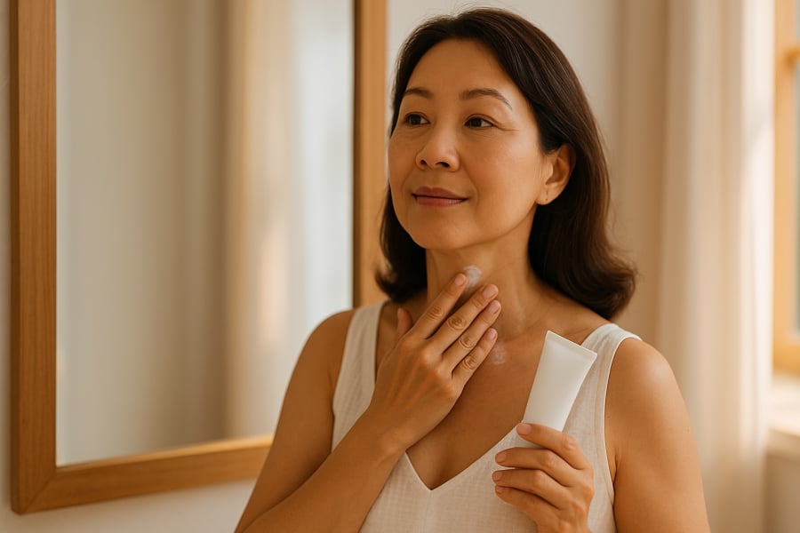 Không cần đến tuổi 50 hay 60, chỉ từ sau 35 là nhiều chị em đã bắt đầu thấy dấu hiệu lão hóa: cổ nổi gân, da nhăn nhẹ, vùng ngực bắt đầu nhão và xệ dần, đặc biệt là sau sinh hoặc giảm cân.