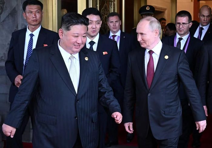 Sau buổi duyệt binh, ông Kim Jong Un và ông Putin cùng di chuyển trên một chiếc xe đến nhà khách quốc gia để tiến hành cuộc hội đàm song phương kín. Nga và Triều Tiên - hai quốc gia cùng chịu các lệnh trừng phạt quốc tế nặng nề, đã ký hiệp ước phòng thủ chung năm 2024.