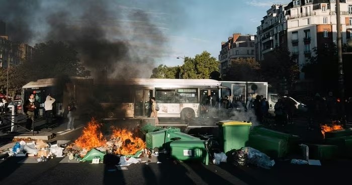 Người biểu t́nh đốt cháy xe buưt ở Pháp. Ảnh: CBS.