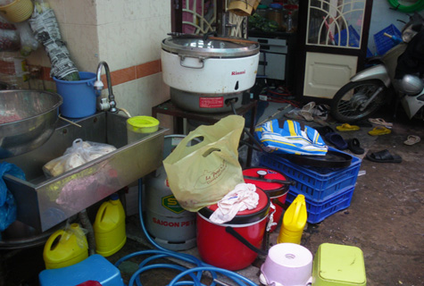 Các dụng cụ chế biến thức ăn của cơ sở Minh Tâm bày la liệt khắp nơi