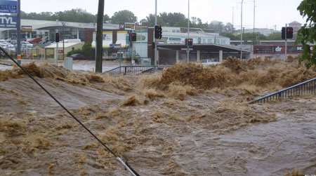 Lũ quét cực mạnh đã ập đến thành phố Toowoomba của bang Queensland, Australia, và nhiều nơi khác. Lũ quét xảy ra khi bang vẫn đang phải vật lộn chống chọi với trận lụt tồi tệ nhất trong vòng 50 năm qua.