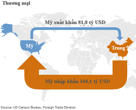 Về thương mại, Mỹ mua nhiều của Trung Quốc hơn là bán cho họ. Theo Cục thống kê của Mỹ, tổng giá trị xuất khẩu của họ sang Trung Quốc năm 2010 đạt 81,8 tỷ USD, trong khi nhập khẩu tới 344,2 tỷ USD.