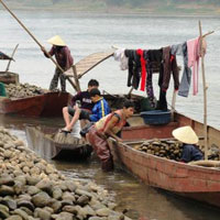 Trên khúc sông những con thuyền mùa nước cạn nối đuôi nhau dập dình theo từng con sóng vỗ. Khung cảnh buồn thiu, vắng lặng khác thường. Mặc cho Tết đã cận kề nhưng hai bên bờ sông chỉ có tiếng máy cẩu gầm rú, hút cát cùng với bước chân nặng nhọc của những người làm nghề bốc đá.