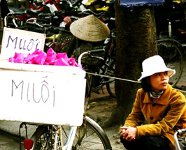 Nhiều người đi lễ chùa về sớm cũng đã dừng chân bên xe muối của chị Phương (Mễ Trì, Hà Nội) để mua chút muối lấy may đầu năm. Chị Phương cho biết ngay từ sớm chị đã đạp xe xuống các khu tập thể, dân cư để bán muối. Với khoảng 10 kg, chị chỉ bán 3 tiếng là hết. Chị tâm sự, sau chuyến hàng này chị sẽ có thêm chút tiền để chi tiêu cho con trong việc học tập.