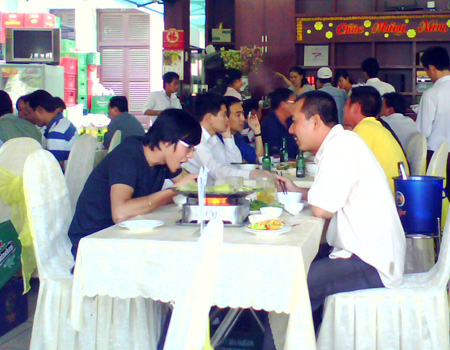 Tại một quán hải sản trên đường Cao Thắng, quận 3 chiều mùng 5 Tết, lượng khách đông nghịt. Tất cả không gian của quán đều được tăng cường bàn ghế dày đặc ngay cả trên lối đi nhưng vẫn không đủ chỗ ngồi cho khách. Nhiều người đến trễ, sau một hồi loay hoay tìm bàn không còn, đành quay đi quán khác.