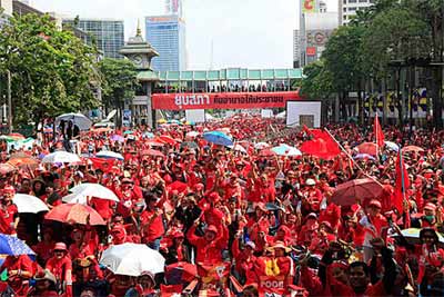 Mặc áo đỏ, vẫy băng rôn, cờ và cái vỗ tay bằng nhựa, đám đông hò reo lớn khi các nhân vật chủ chốt của phong trào phát biểu trước những người biểu tình. "Hôm nay, chúng ta tới đây để đòi công bằng cho những người đã chết cách đây 9 tháng tại đúng địa điểm này", Thida Thavornseth, lãnh đạo phong trào áo đỏ cho hay.